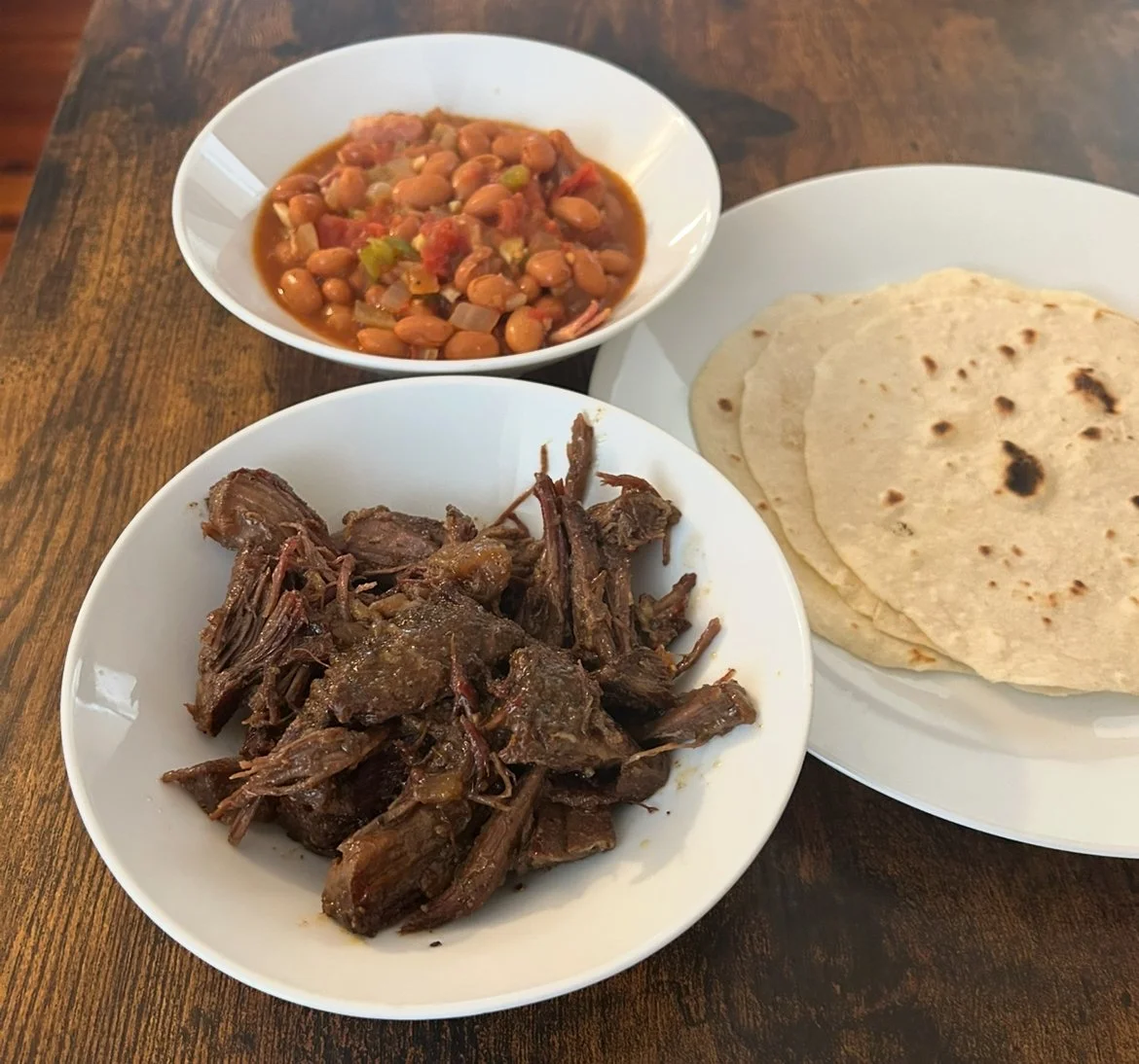 Barbacoa served alongside flour tortillas and frijoles borrachos.